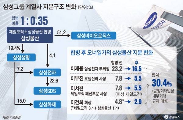 기업 합병의 기준이 되는 합병비율은 일정 기간동안 두 회사의 주가를 평균해서 계산합니다. 따라서 주가가 높은 기업에게 유리한 구조죠. 당시 이재용 회장이 제일모직 지분은 23.2%나 갖고 있었는데, 삼성물산 지분은 하나도 없었습니다. 그래서 삼성물산이 일부러 래미안 아파트 사업을 축소해서 삼성물산 가치를 제일모직보다 확 낮추고 이재용 회장에게 유리한 합병 구조를 만든 것 아니냐는 분석이 나왔습니다.