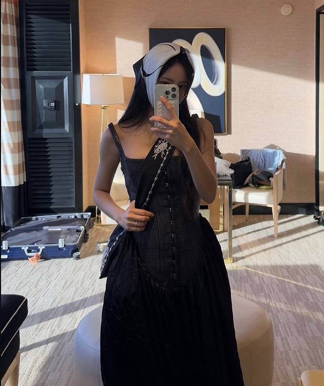 효민은 올블랙 백리스 드레스에 우아한 크로스백 디테일을 더해 강렬하면서도 페미닌한 실루엣을 완성했습니다.