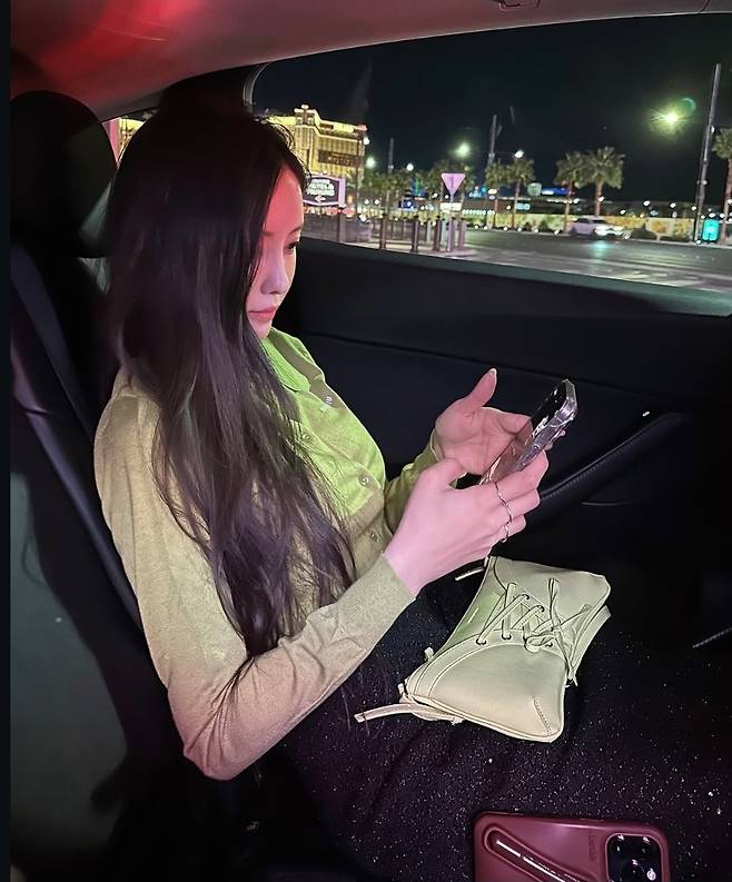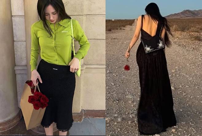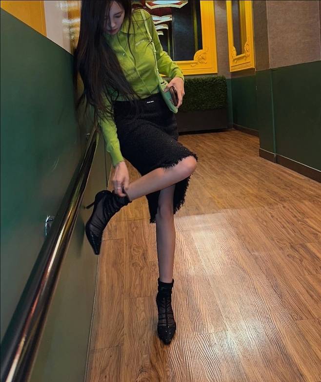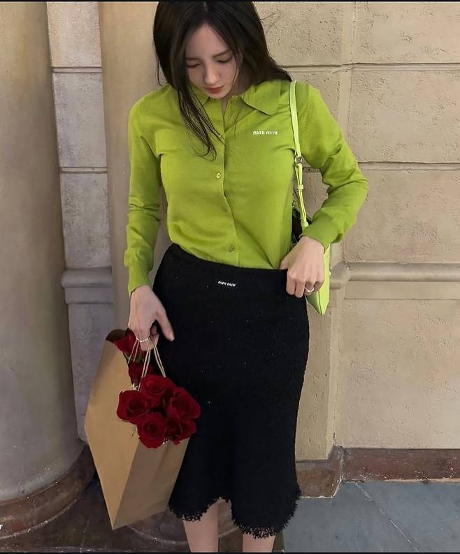 또 다른 컷에서는 라임 컬러 셔츠와 블랙 스커트로 캐주얼한 매력을 선보이며, 세련된 스타일 감각을 입증했습니다.