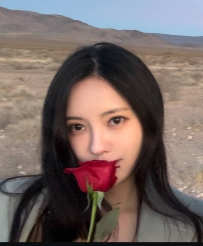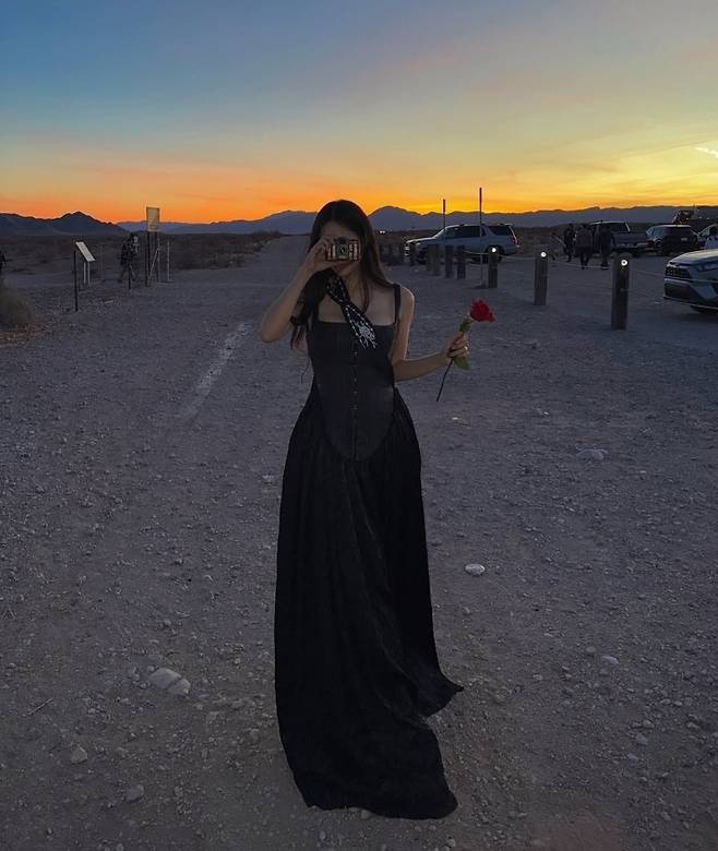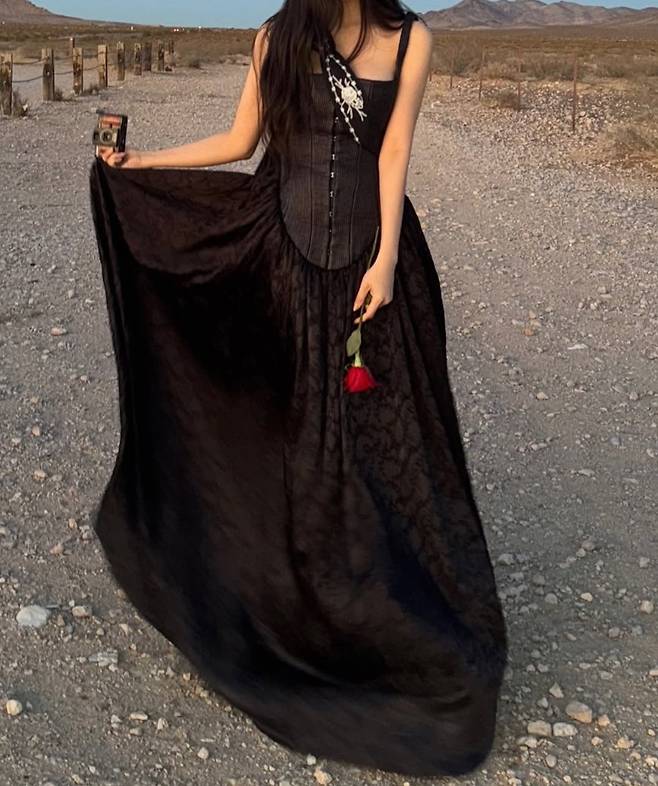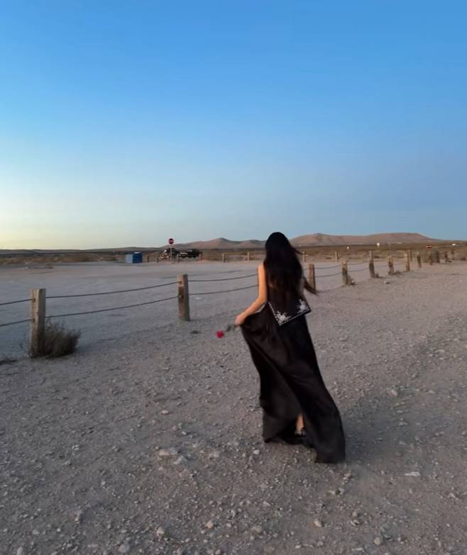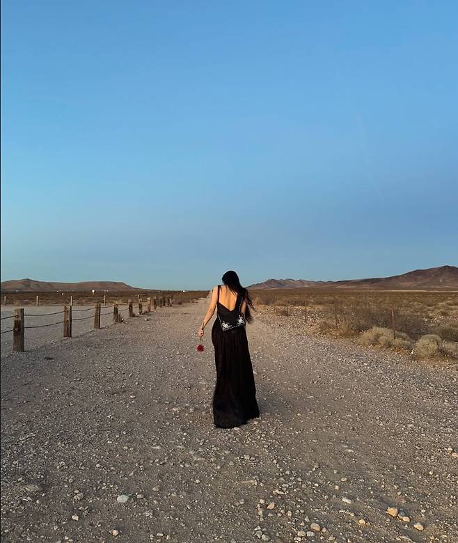 사막을 배경으로 흐르는 듯한 블랙 롱드레스가 영화 속 한 장면 같은 감성을 연출하며, 특유의 고혹적인 분위기가 돋보였습니다.
