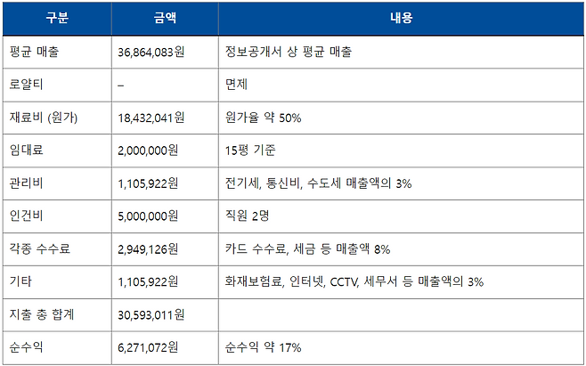 - 위 표의 금액은 당사가 그동안의 가맹점 운영 경험을 토대로 추정한 것으로 실제 지불 금액과는 다를 수 있습니다.