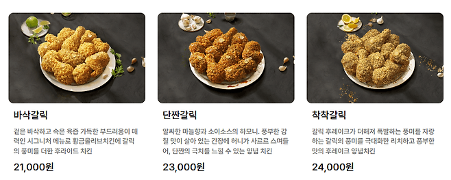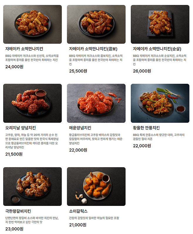- 스모크치킨 : 엉치살을 물참나무에 12시간 이상 숙성 및 훈연시켜, 스모키한 풍미가 일품인 훈연치킨