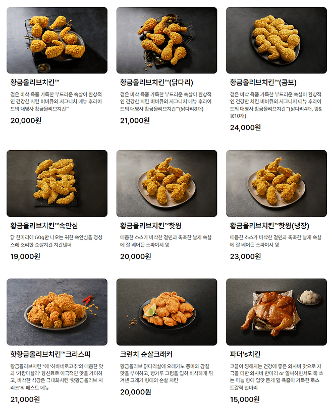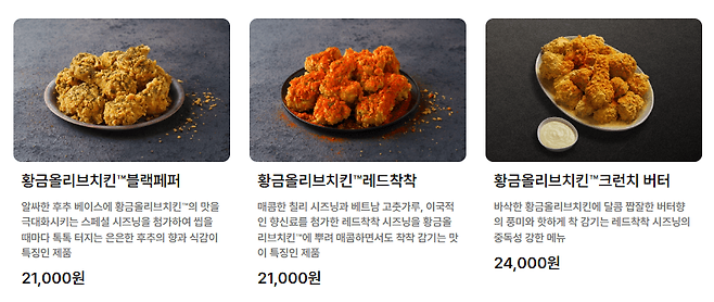 - 핫황금올리브크리스피 : 황금올리브치킨™에 ‘하바네로고추’의 매콤한 맛과 ‘가람마살라’ 향신료로 이국적인 맛을 가미하고, 바삭한 식감은 극대화시킨 ‘핫황금올리브 시리즈’의 베스트 메뉴