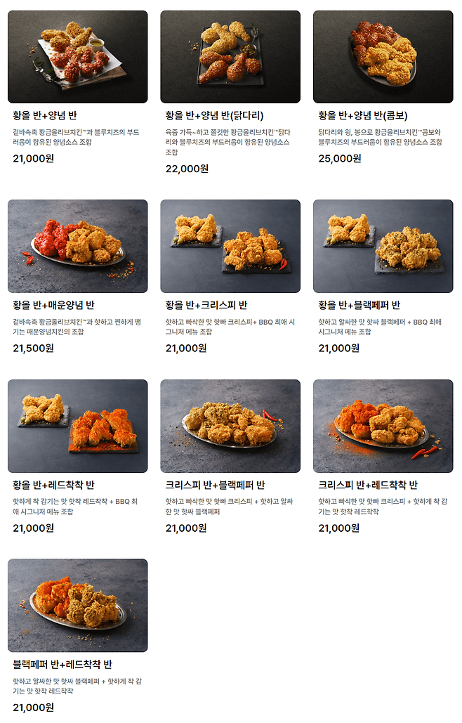- 황금올리브치킨 : 양념반,후라이드반겉바속촉 황금올리브치킨™과 블루치즈의 부드러움이 함유된 양념소스 조합