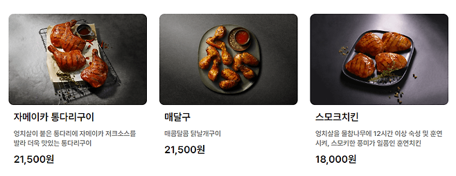 - 스모크치킨 : 엉치살을 물참나무에 12시간 이상 숙성 및 훈연시켜, 스모키한 풍미가 일품인 훈연치킨
