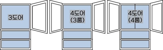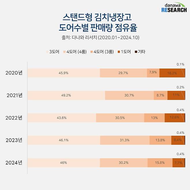 스탠드형 김치냉장고의 도어는 용량과 편의성을 의미한다고 해도 과언이 아니다. 2020년부터 현재까지 3도어와 4도어가 강세를 보이고 있는데 두 유형의 점유율을 합하면 무려 90%가 훌쩍 넘는다. 특히, 4도어는 3룸과 4룸을 합치면 2020년 37.6%에서 2024년 46%까지 치고 올라갔다. 반면에 1도어 제품은 2022년까지 10% 남짓한 점유율을 유지하다 2023년부터 한 자리수로 떨어지며 점점 설 자리를 잃고 있다.