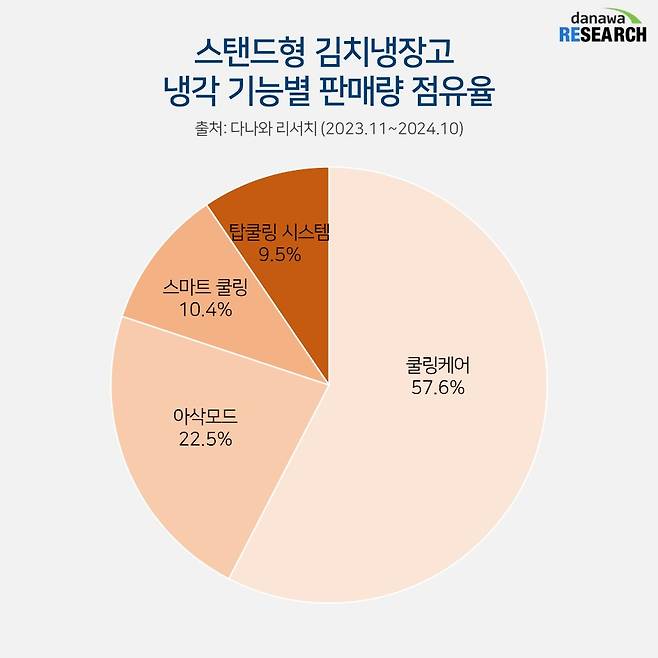 김치냉장고의 주요 기능은 뭐니 뭐니 해도 냉각 기능이다. 스탠드형 김치냉장고의 대세 냉각 기능은 '쿨링케어'다. 57%의 점유율을 보인 쿨링케어는 내장된 쿨링 팬으로 일정시간 마다 제품 구석구석에 냉기를 전달하는 기능으로 사각지대 없이 온도를 고르게 유지할 수 있어 더욱 신선한 보관이 가능하다.