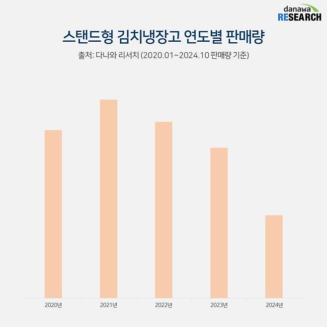연도별 스탠드형 김치냉장고 판매량을 보면 2021년에 상승하는 모양새를 보였지만 매년 소폭 하락하는 모습을 보이고 있다. 올해 10월까지 판매량을 보면 작년의 절반 수준에 머물고 있는데 김치냉장고 시장은 김장 시기인 11월과 12월에 가장 활발해진다는 점을 고려해 볼 때 올해의 판매량은 작년과 비슷한 수준에 머물 것으로 예측된다.