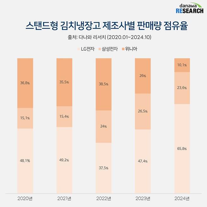 김치냉장고는 다른 가전 제품과는 다르게 국내 제조사가 독점하고 있다. 김치냉장고라는 품목 자체가 국내에서 대부분 소비되는 특성이 있기 때문인데 국내 스탠드형 김치냉장고 시장은 LG전자가 이끌고 있다. 이미 2020년부터 50%에 가까운 점유율을 차지하며 명실상부한 김치냉장고의 강자로 자리잡았고 2024년에는 65%까지 끌어올려 2위와의 격차를 더 벌렸다. LG전자는 스탠드형 김치냉장고의 원조로 상하부 간접 냉각을 사용해 내구성이 좋고 '유산균 김치'와 같은 숙성 기능과 각종 식재료 보관 기능이 소비자들 사이에서 큰 호응을 얻었다.