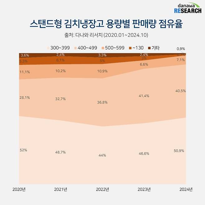 몇 년 전부터 가전 업계에는 거거익선 트렌드가 휩쓸었다. 각 제조사마다 경쟁적으로 가전 제품의 사이즈를 키워 출시했다. 스탠드형 김치냉장고 또한 거거익선을 따라가기 위해 500L대의 대용량 제품들이 출시되었는데 다나와 리서치에 따르면 반응은 뜨뜻미지근하다. 2022년까지는 나름 10%의 점유율을 유지했으나 2023년에는 6.6%로 떨어졌다.