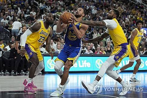 Golden State Warriors guard Stephen Curry (30) drives against Los Angeles Lakers forward LeBron James (23) and Los Angeles Lakers guard D'Angelo Russell during the second half of a NBA preseason basketball game Tuesday, Oct. 15, 2024, in Las Vegas. (AP Photo/John Locher)