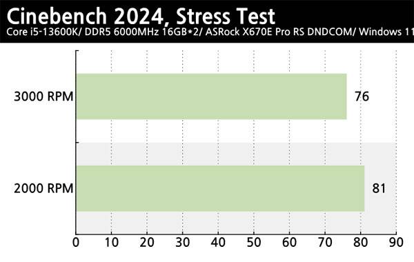 참고로 3000 RPM과 2000 RPM 모델의 스펙상 최고 소음도는 각각 40.1dBA와 24.6dBA로 그 차이는 약 15dBA인데 비해 실제 차이는 약 10dBA에 그쳤다. 단지, 이는 2열 수랭 쿨러에 두 개의 쿨링팬을 장착한 상태인 만큼 단일 팬과는 환경이 다르고, 라디에이터 및 먼지 필터 등 사용 환경이 영향을 끼친 것으로 판단된다.