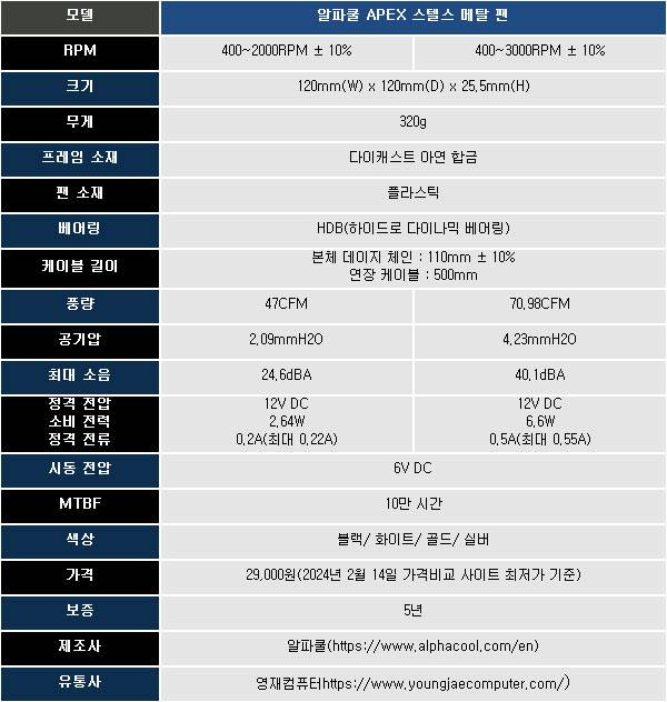 특히, 일반적인 시스템 팬의 보증 기간이 1년, 고급형이라도 3년 정도인 것에 비해 그보다 긴 5년의 보증 기간이 지원되는 만큼 장기간 안심하고 사용할 수 있는 것도 알파쿨 APEX 스텔스 메탈 팬의 또 다른 장점이 아닌가 생각된다.