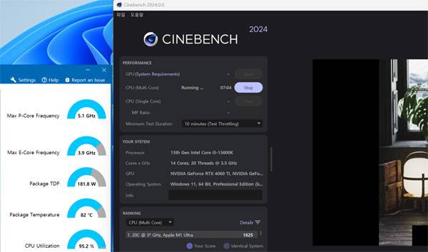한편, 성능은 어떤지 시네벤치 2024를 구동하며 코어 i5-14600K의 CPU 패키지 온도를 측정했다. 이때 쿨러는 120mm 2열 일체형 수랭 쿨러인 BEICED II 240 ARGB에, 쿨링팬과 워터 펌프의 동작 속도는 최고치로 고정했다.