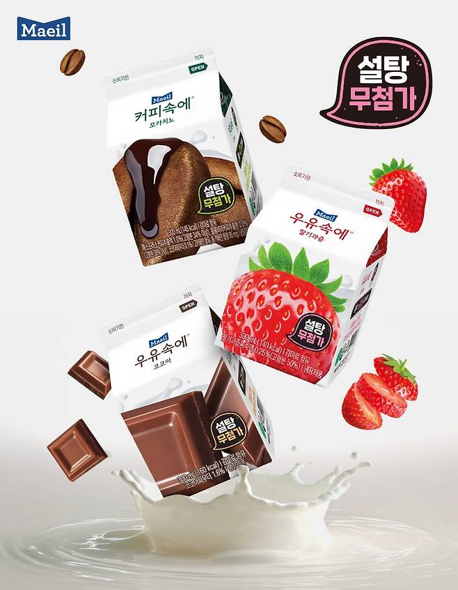 [이포커스] 매일유업이 가공유 브랜드 ‘우유속에’ 3종(딸기과즙, 코코아, 커피속에 모카치노)을 설탕 무첨가로 리뉴얼 출시했다.