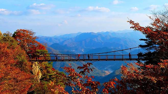 케이블카 상부 정류장에서 도보 5~10분 거리, 붉은 다리가 기암괴석 사이를 가로지르는 장관이 펼쳐진다. 바로 대둔산의 두 번째 명물 금강 구름다리다.