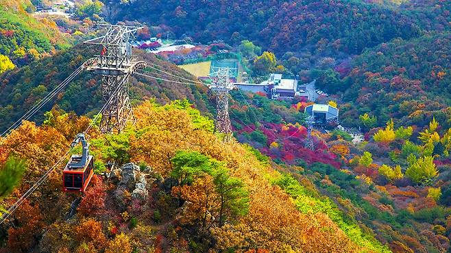 주차장에 차를 세운 후 약 10분을 걸으면 케이블카 탑승장이 나온다. 힘든 등반 없이 산 중턱까지 올라, 가을 산세를 여유롭게 감상할 수 있는 최고의 선택이다.