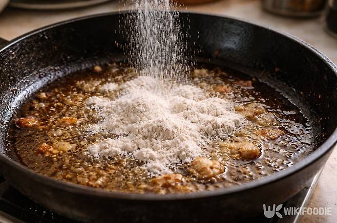 이럴 때는 물을 쓰지 말고 밀가루부터 뿌리는 것이 핵심이다. 식은 팬 위에 밀가루를 한 줌 넉넉히 뿌리면, 남아 있던 기름을 빠르게 흡수하며 덩어리로 변한다. 이 덩어리를 키친타월로 닦아내 쓰레기통에 버리면 기름 처리가 끝난다.