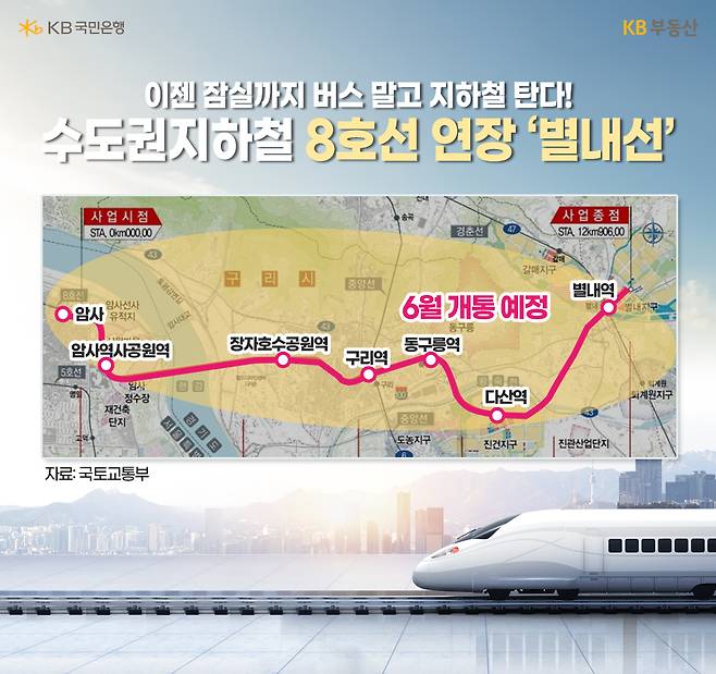 GTX-A 노선과 함께 관심 받고 있는 수도권 노선은 바로 서울지하철 8호선 연장선인 별내선입니다. 8호선 암사역에서 경춘선 별내역까지를 잇는 노선으로, 6월 개통될 예정입니다. 개통 후에는 별내에서 잠실까지 27분, 구리에서 잠실까지 20분 정도 소요될 예정입니다.