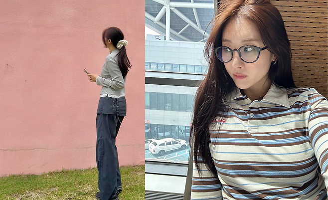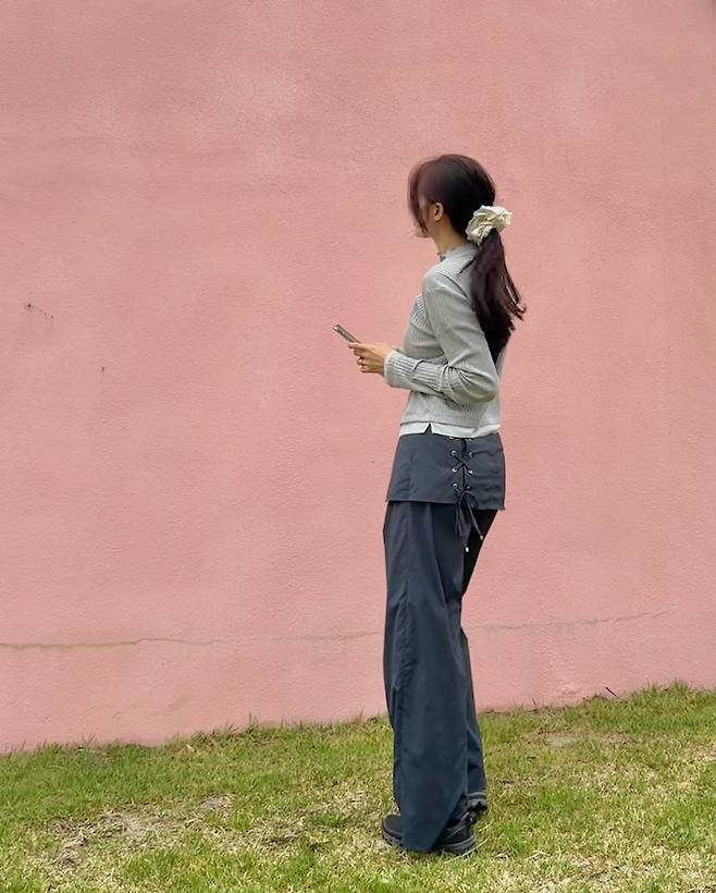 분홍빛 벽을 배경으로 한 문현아의 모습이 시선을 사로잡는다. 회색 니트 톱과 블랙 와이드 팬츠의 조합으로 심플하면서도 세련된 스타일을 연출하고 있다. 특히 허리 부분의 레이스업 디테일이 포인트인 팬츠는 캐주얼함 속에 여성스러움을 더하고 있다. 헤어를 묶은 뒤 화이트 스크런치로 마무리해 청순하면서도 트렌디한 분위기를 완성했다. 스마트폰을 손에 든 채 일상적인 모습을 보여주는 것이 친근감을 더한다.