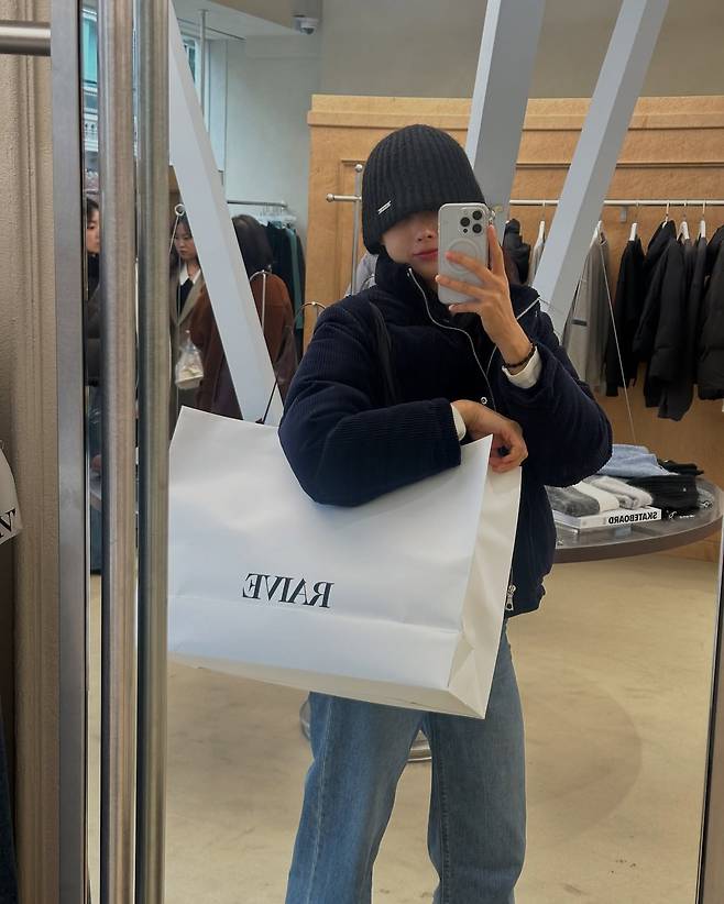 검은색 니트 비니와 네이비 코트를 매치한 문현아가 RVME 쇼핑백을 들고 있는 모습이 포착됐다. 캐주얼한 청바지와 함께 연출한 이 룩은 세련된 쇼핑 데이트 스타일을 완성하고 있다. 특히 귀에 걸린 이어폰과 아이폰으로 셀카를 찍는 모습이 현대적인 분위기를 자아내며, 얼굴을 가린 채 패션에 집중하게 만드는 연출이 돋보인다. 쇼핑몰 피팅룸의 거울에 비친 모습에서 스타일리시한 겨울 패션의 정석을 보여주고 있다.