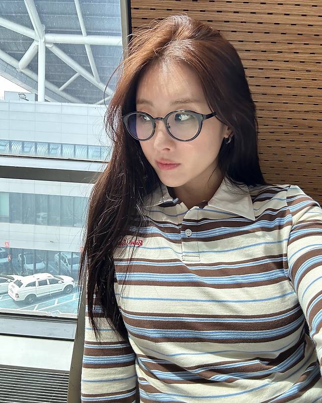 둥근 안경과 함께 연출한 스트라이프 폴로 티셔츠 룩이 레트로한 감성을 자아내고 있다. 브라운, 블루, 화이트 컬러가 조화롭게 어우러진 스트라이프 패턴은 클래식한 매력을 발산하며, 자연스럽게 흘러내린 긴 머리카락이 여성스러운 분위기를 더한다. 창가에서 촬영된 이 룩은 도시적인 배경과 대비되어 더욱 세련된 느낌을 주고 있다. 특히 안경을 통해 지적인 이미지를 강조하며 캐주얼하면서도 스타일리시한 일상 패션을 완벽하게 소화하고 있다.