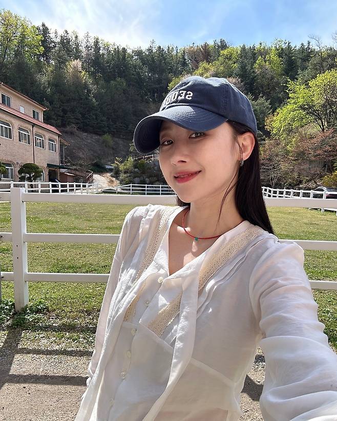 푸른 하늘과 초록 숲을 배경으로 화이트 블라우스를 입은 문현아의 모습이 상큼한 봄 분위기를 자아내고 있다. 네이비 'SEOUL' 캡모자와 화이트 블라우스의 조합은 청순하면서도 활동적인 이미지를 연출하고 있다. 레이스 디테일이 가미된 블라우스는 여성스러움을 더하며, 붉은색 실 목걸이가 포인트 액세서리로 활용되었다. 시골 풍경과 어우러진 이 룩은 도시적 세련미와 전원적 순수함이 공존하는 매력적인 스타일을 완성하고 있다.