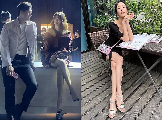 앉은 자세에서도 드러나는 완성도 높은 실루엣과 실버 샌들 힐이 룩에 강렬함과 고급스러움을 동시에 부여했습니다.