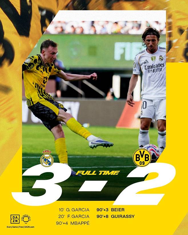 주드 벨링엄의 친정팀 재회로 세간의 주목을 끌었던 FIFA 클럽 월드컵 8강 선제골의 주인공은 레알 마드리드였다. 전반 10분, 아르다 귈러가 페널티 박스 안쪽으로 곤살로 가르시아에게 절묘한 궤적의 크로스를 시도했고, 가르시아가 발리 슛으로 마무리에 성공하며 선제골을 기록했다.