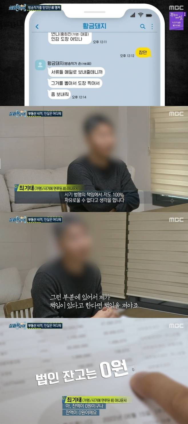 12일 방송된 MBC 시사·교양프로그램 '실화탐사대'에서는 지역방송 앵커가 연루된 수백 억 대 부동산 사기 사건이 다뤄졌다.