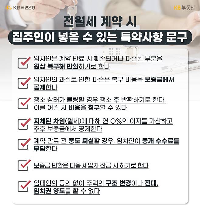 역전세난과 전세사기로 곳곳에서 피해 사례가 나오고 있습니다. 기본적인 주택임대차계약서만으로는 계약 후 발생할 수 있는 다양한 분쟁을 해결하기 어려울 수 있는데요. 이를 방지하기 위해 계약서에 넣으면 좋을 특약으로 어떤 것이 있을까요? KB부동산이 임차인, 임대인 입장에서 각각 고려해야 할 특약사항 문구를 정리해 드립니다.