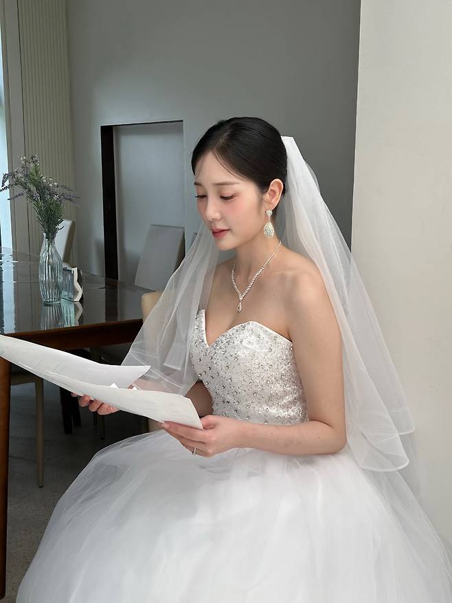 회색빛 벽을 배경으로, 순백의 웨딩드레스를 입은 그녀가 편지를 들고 있었다. 고개를 살짝 숙인 채 몰입하는 모습은 마치 진짜 신부처럼 고요하고 설레었다. 베일 너머로 드러난 얼굴선, 목에 걸린 섬세한 네크리스, 그리고 비즈로 장식된 드레스가 만들어낸 찰나의 순간은 현실과 드라마의 경계를 흐리게 했다.