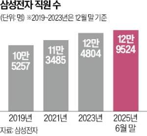삼성은 2022년부터 2026년까지 5년간 총 8만 명을 채용하겠다는 계획을 밝히기도 했다. 신입 사원을 꾸준히 뽑으면서 직원 수도 늘고 있다. 2019년 10만5257명이던 삼성전자 국내 임직원은 지난해 6월 말 기준 12만9524명으로 23%(2만4267명) 증가했다.