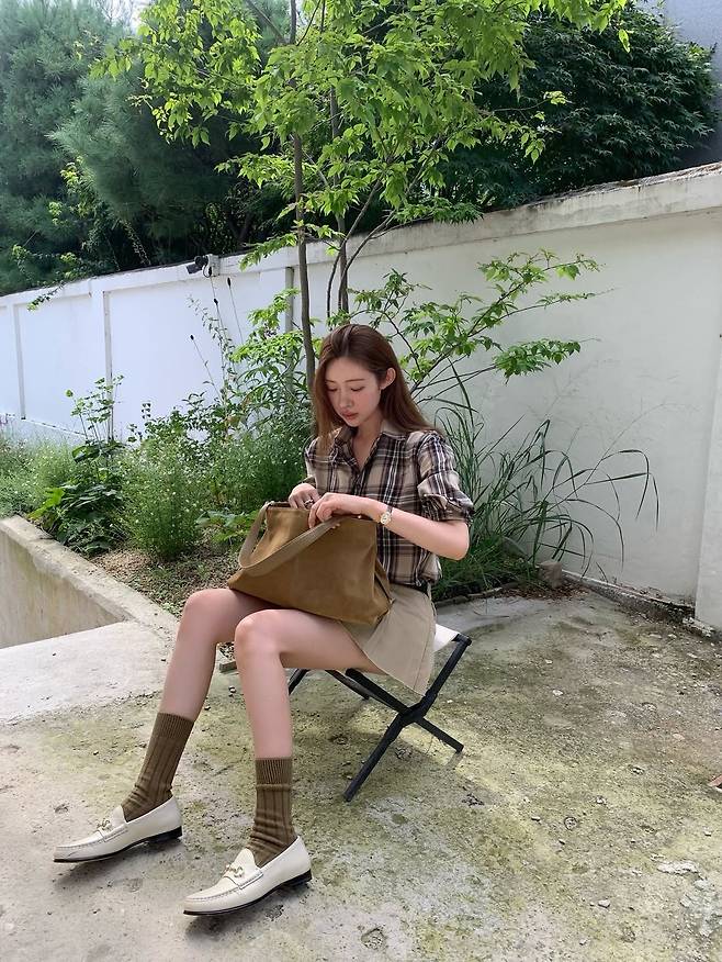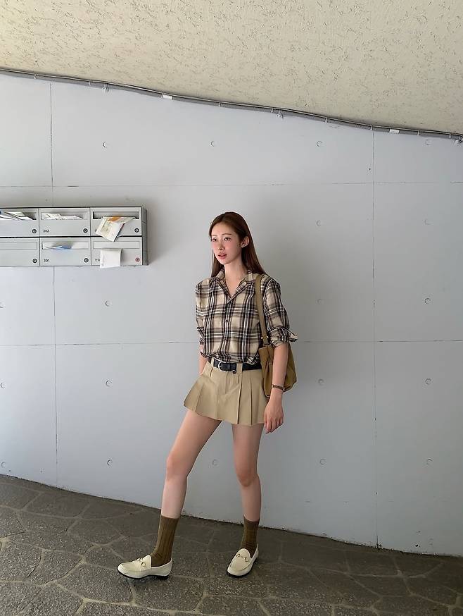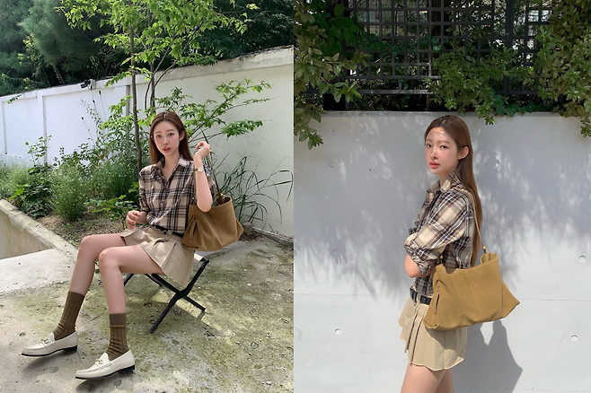 그녀가 입은 체크 셔츠와 플리츠 스커트, 그리고 로퍼와 양말의 조합은 단순한 OOTD를 넘어,