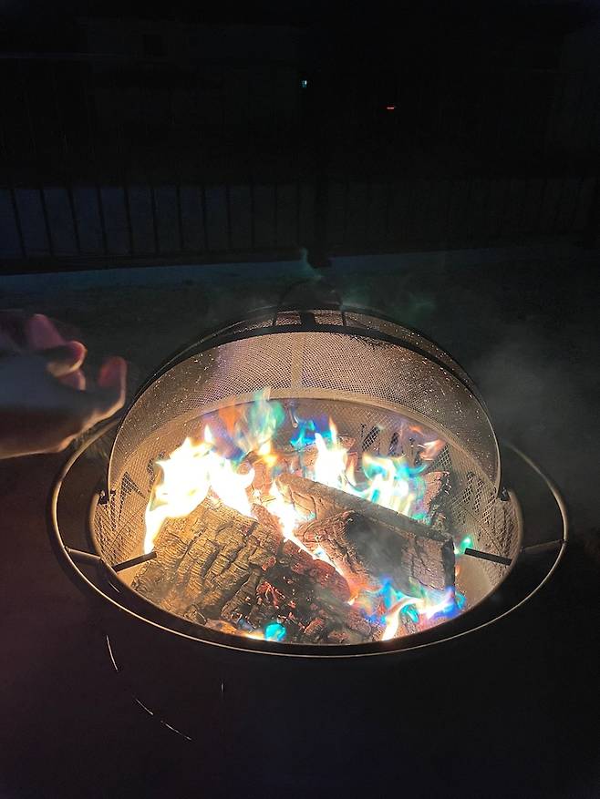 아이의 친구가 오로라 가루라며 선물을 줬는데, 불을 피우고 잦아들 즈음에 가루를 휙 뿌려주면 저렇게 오묘한 초록과 보라색의 불빛이 난답니다. 영화도 보고 불멍도 하고 오로라 가루까지 아이도 매우 좋아하지만 저희 부부도 아주 애정하는 마당에서의 시간입니다.