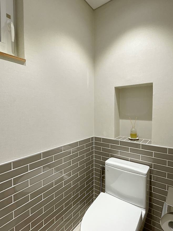 문을 열면 있는 변기실입니다. 이 공간은 특이하게 반은 타일을 붙였고 위쪽 반은 벽지를 붙였습니다. 처음에는 괜찮을까 고민을 많이 했는데, 완성된 인테리어는 정말 예뻤어요. 포근한 느낌도 있고 모던한 느낌도 있어서 정말 마음에 드는 공간이 되었답니다.