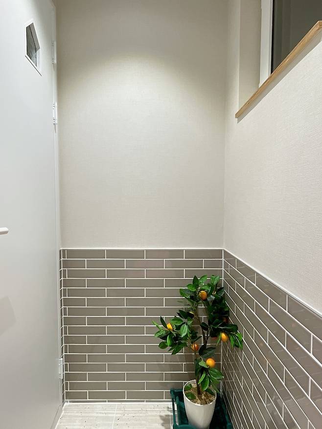변기 앉으면 보이는 공간입니다. 모던하우스에서 감귤 향이 나는 방향제를 사서 놓아두었는데 원래 집에 있던 귤나무와 잘 어울릴 것 같아 이곳에 두었습니다. 주택을 지으면서 좋은 점 중 하나는 창문을 내고 싶은 곳을 선택할 수 있다는 것이었는데, 1층도 2층도 욕실과 변기실에 모두 창문을 내어서 정말 좋았습니다. 환기가 잘되는 욕실을 유지할 수 있어 정말 좋아요.