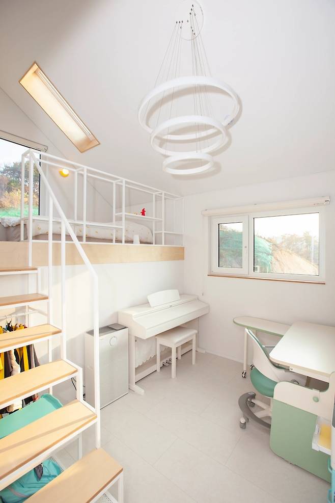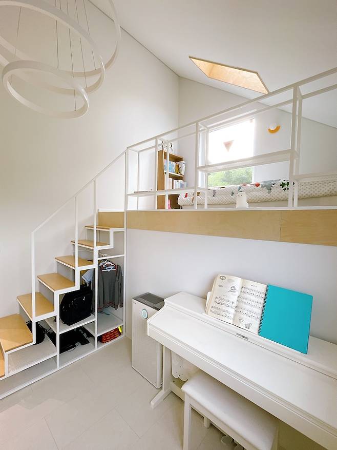 계단 밑 공간에 수납도 가능하고, 옷을 걸 수도 있어서 학교 교복이나 체육복을 걸어두었더니 혼자서도 잘 찾아 입고 학교 갈 준비도 스스로 하는 어린이가 되었답니다.아이방은 층고가 워낙 높아서 웬만한 조명으로는 조도가 나오지 않았습니다. 그래서 저 3중으로 된 조명을 선택했고 아이방과 잘 어울리며 밝게 유지해주는 아이템이 되었습니다.
