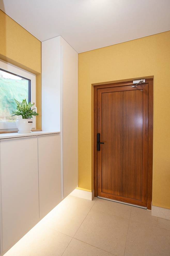 창호는 모두 독일식 창호이고 살라만더 제품입니다. 가장 신경을 많이 쓴 부분이 단열이어서 많은 고민하지 않고 바로 살라만더를 선택했습니다. 저 노랑 벽지는 정말 정말 고민을 많이 했는데, 우드 톤의 현관문과 잘 어우러져서 따뜻한 느낌을 줍니다. 식물하고도 잘 어울려요.