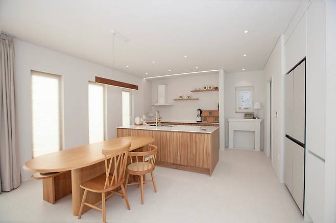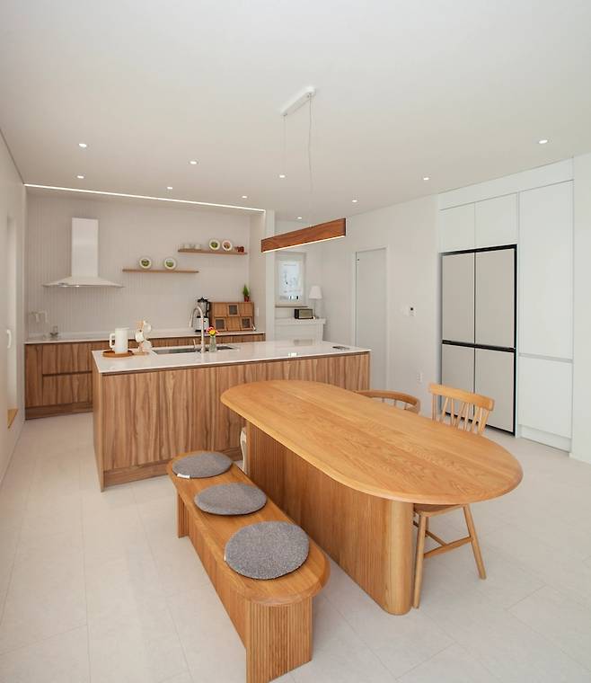 거실과 주방의 경계가 뚜렷하지 않아서 대면형 주방을 선택하였고, TV와 소파가 없는 거실이다보니 큰 식탁을 두어 주방과 거실이 연결되는 동선입니다. 아이가 책을 읽거나 숙제를 할 때 주방 일을 하면서 같이 있다는 안정감을 줄 수 있다는 점이 가장 큰 장점입니다.