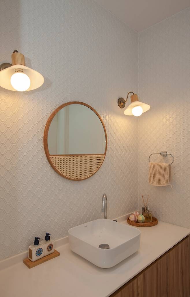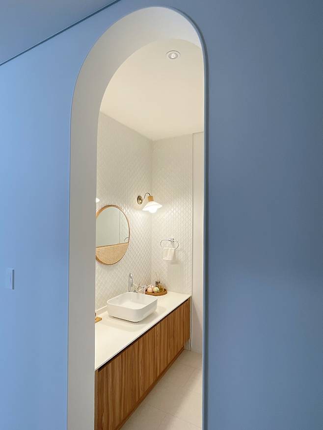 1층의 아치 안쪽은 건식 세면대와 변기실이 따로 있습니다. 이 공간이 정말 예쁜데 사진이 잘 안 나오네요. 현관으로 들어와 바로 손을 씻기도 편하고 변기실도 독립적으로 있어서 더 편해요. 우디크의 원형 오크 거울인데 자칫 올드할수도 있는 느낌의 타일을 감성적으로 꾸며줍니다. 고급진 느낌이지만 또 포근한 느낌도 함께 주는 공간입니다.
