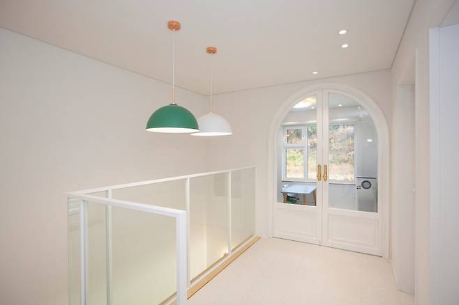 2층과 연결되어 있는 계단을 올라오면 보이는 작은 복도 겸 공간입니다. 지금은 이 공간에도 트리가 있는데, 둥그런 조명 밑 공간을 어떻게 꾸미면 좋을지 고민하고 있어요. 저 철제 아치문은 아이의 플레이룸으로 통하는 곳입니다. 시공해주시는 분들이 저 문을 제작하시느냐고 많은 고생을 하셨습니다. 그래서 정말 예쁘게 임팩트 있는 공간이 되었습니다.