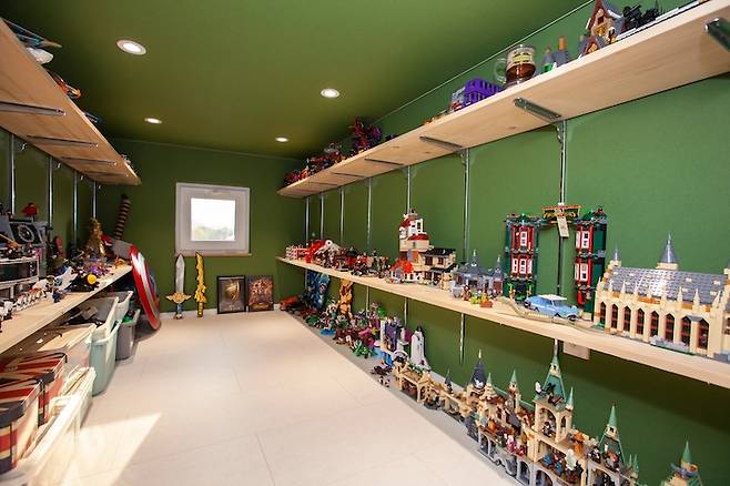 레고들은 정말 엄청 많습니다. 맨 위 선반까지 양옆으로 꽉꽉 차있어요. 숙제를 하고 나서는 이 공간에서 레고 피규어들을 가지고 재미있게 놀거나, 남은 레고 부품을 모아놓은 것들로 다른 것들을 만들며 시간을 보냅니다. 아이가 제일 좋아하는 공간이 될 수 밖에 없지요.