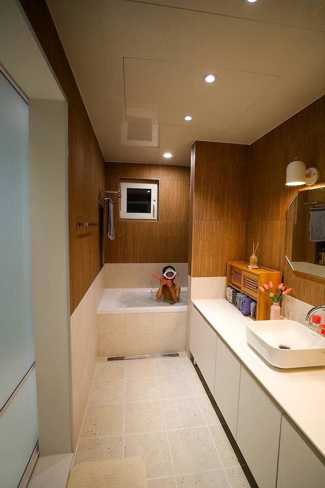 물 받아 물놀이 하길 좋아하는 아이를 위해 욕조는 필수 아이템이었습니다. 욕조 옆 쪽도 바닥과 아래쪽 벽 타일을 붙여달라 부탁 드려 통일감을 주었습니다. 조적 욕조를 하고 싶었지만 욕조를 두지 않고 타일만 붙여 욕조로 사용하는 건 아무리 시공을 잘해도 누수의 위험이 있다고 하셔서 욕조 벽에 타일을 붙여 조적 욕조의 느낌을 주었습니다. 안전하고 또 만족한 인테리어가 되었습니다.