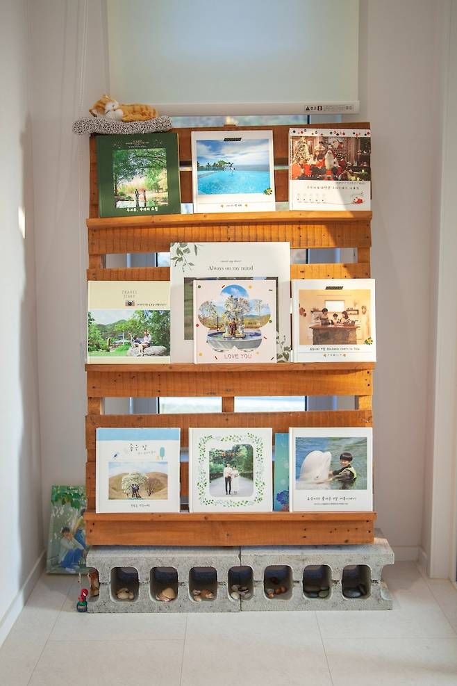 저 뒤쪽에 보였던 팔레트는 직접 만든 사진책 수납 공간입니다. 사실 남편의 친구분이 5년 전 쯤 만들어 선물해주신 인테리어인데, 주기적으로 매번 사진 책을 만드는 남편 덕분에 쉽게 추억을 꺼내볼 수 있는 공간이 저희 집의 킬링 포인트가 되어줍니다. 벌써 거의 25권이 넘는 사진책들이 쌓였네요. 벽돌 사이 사이에는 아이가 바다에 갈 때마다 주웠던 조개 껍질들도 고이 넣어두었어요. 추억 가득한 공간입니다.