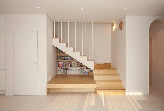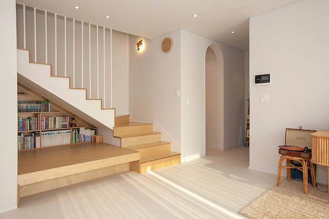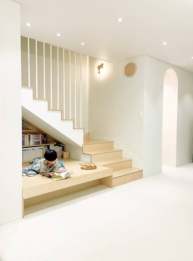 저희는 이사 오기 전부터 거실에 소파와 TV가 없이 '거실의 서재화'로 생활을 해왔습니다. 그래서 주택을 설계할 때도 그렇게 하였고, 2층으로 올라가는 계단 밑 공간은 아이의 독서 평상으로 꾸몄습니다. 좋아하는 책들을 꽂아두고 이 공간에서 누워서 자주 책을 읽습니다. 평상이다 보니 거북 목을 하고 책을 읽어 지금은 보니타 빈 백을 사서 올려두었습니다.