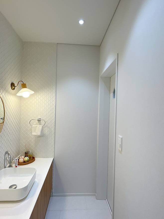 그리고 건식 세면대 반대편으로는 귀여운 집 모양의 무늬가 있는 문이 있는데, 여긴 변기만 둔 변기실입니다. 1층은 대부분 손님용으로 욕실을 사용할 것을 생각하여 샤워실은 두지 않았고, 최대한 거실과 주방이 넓어 보여야 했기에 이렇게 설계하였습니다.