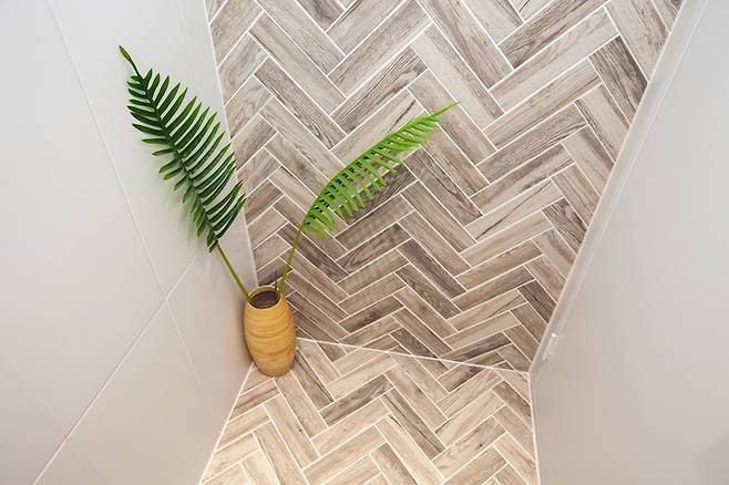 변기에 앉으면 보이는 타일입니다. 변기실의 타일은 바닥과 앞쪽 벽은 헤링본 모양으로 맞춰 나무 질감의 타일을 이어붙여 연속감이 느껴지고 모든 벽을 이렇게 하면 정신이 없을 것 같아서 나머지 양쪽 벽은 기본 흰색 타일을 붙였습니다.