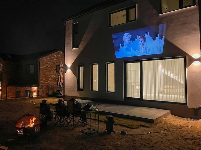 요즘은 빔 프로젝트도 매우 상용화되어서 이렇게 하얀 벽을 이용하여 아이들과 마당에서 영화도 볼 수 있어요. 10월 말 쯤이어서 밤에는 그래도 쌀쌀했지만 참나무로 불을 피우고 친구들과 함께 따뜻한 온기를 느끼며 감상했답니다.