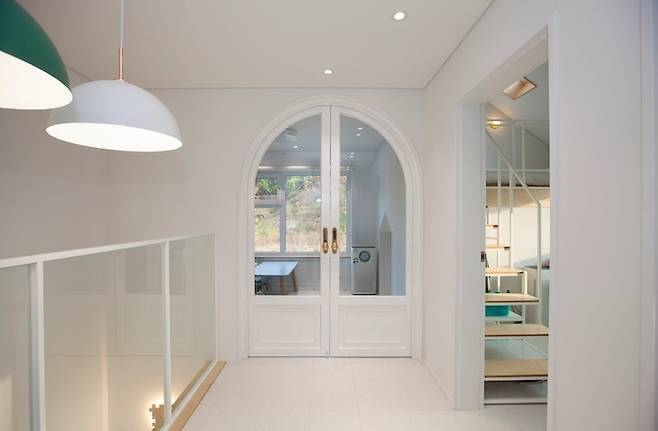 2층과 연결되어 있는 계단을 올라오면 보이는 작은 복도 겸 공간입니다. 지금은 이 공간에도 트리가 있는데, 둥그런 조명 밑 공간을 어떻게 꾸미면 좋을지 고민하고 있어요. 저 철제 아치문은 아이의 플레이룸으로 통하는 곳입니다. 시공해주시는 분들이 저 문을 제작하시느냐고 많은 고생을 하셨습니다. 그래서 정말 예쁘게 임팩트 있는 공간이 되었습니다.